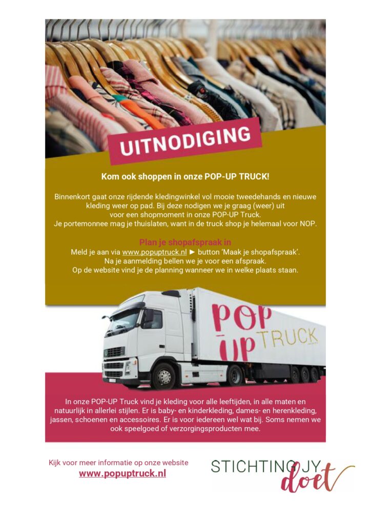 De ‘POP-UP TRUCK’ is een kledingwinkel voor mensen met een krappe beurs. Een winkel waar je een leuke najaars- of winteroutfit scoort voor je kinderen, jezelf of je partner. Een winkel waar je geen geld mee naar toe hoeft te nemen maar waar je gewoon kunt shoppen wat je nodig hebt.